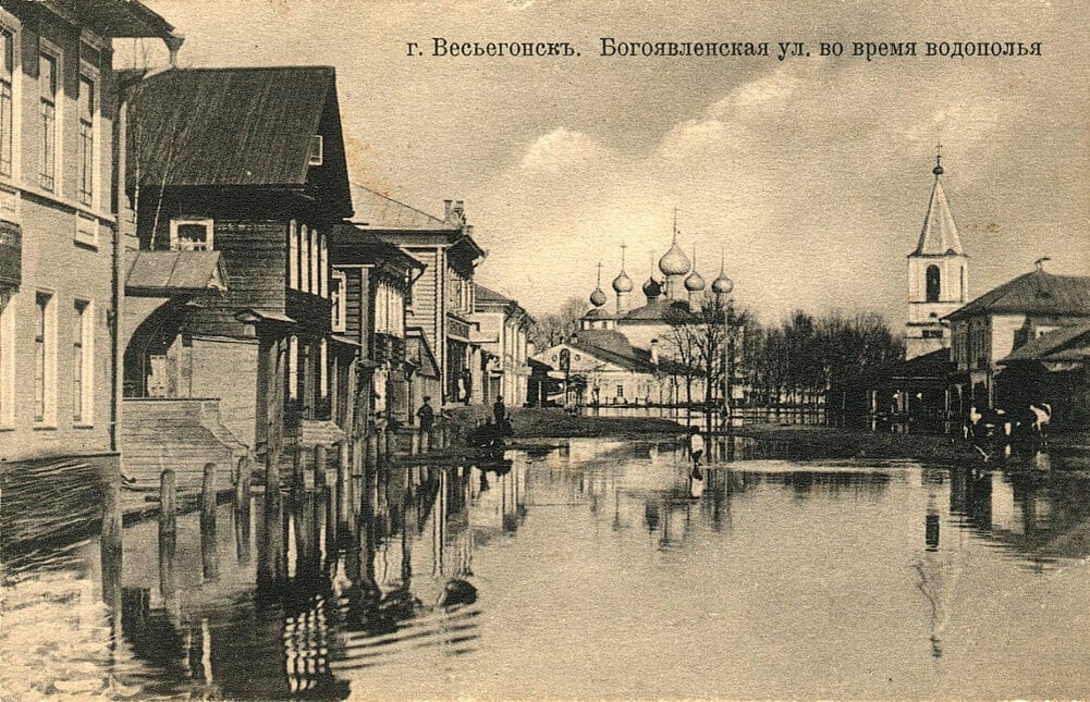 Vesegonsk remonta ao século XVI e, no século XVIII, transformou-se em um movimentado centro comercial. Em geral, tudo como nos outros povoados do Volga da época: quatro mil habitantes, a majestosa Catedral da Epifania, um acolhedor jardim municipal com fonte, respeitáveis casarões de comércio e agitadas praças.