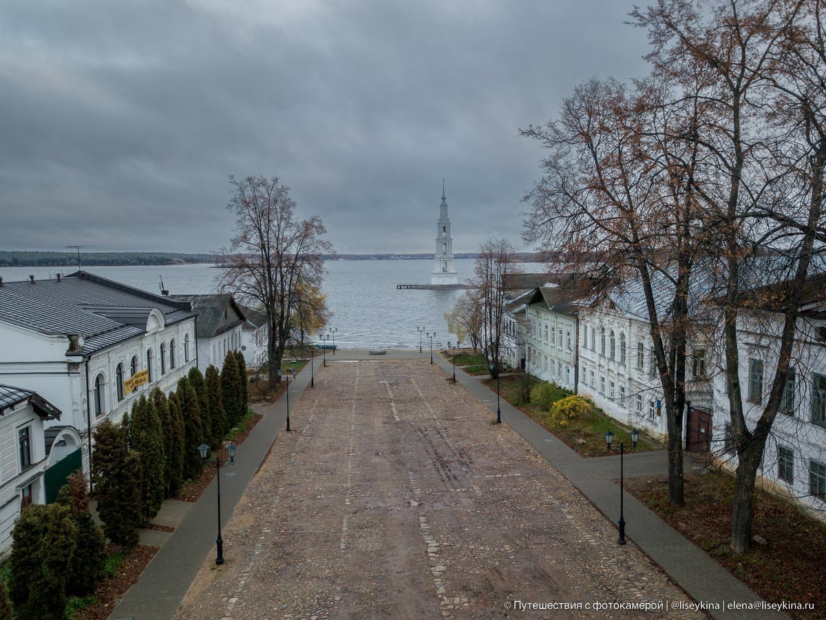 Em 1939, com o início da construção da Usina Hidrelétrica de Uglich, os moradores foram informados de que mais da metade da cidade iria para debaixo d’água. As pessoas foram transferidas para a margem direita do Volga. O Mosteiro da Trindade e muitas igrejas foram desmontados. O campanário foi deixado como marco de navegação para os navios e acabou se tornando o símbolo da cidade.